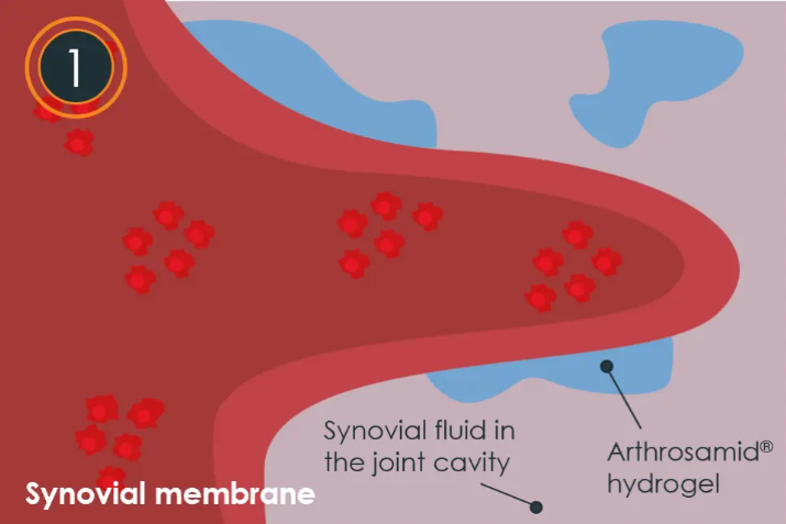 - Delivered with a single injection Arthrosamid® is injected into the synovial cavity, where it disperses within the synovial fluid and adheres to the synovial membrane through the tissue’s normal ‘filtering’ mechanisms.
