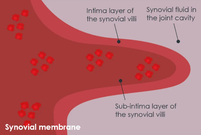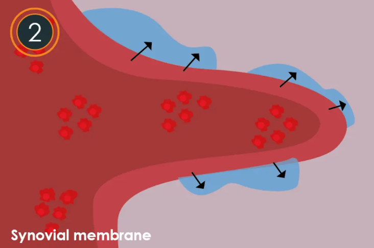 Image left top: Untreated OA knee: In a knee affected by OA, the synovial fluid loses its viscoelastic properties, which are crucial for joint lubrication and shock absorption. This loss leads to a fibrotic synovial membrane which in turn causes an accumulation of inflammatory cells. These inflammatory cells are known to be a precursor to pain and swelling.