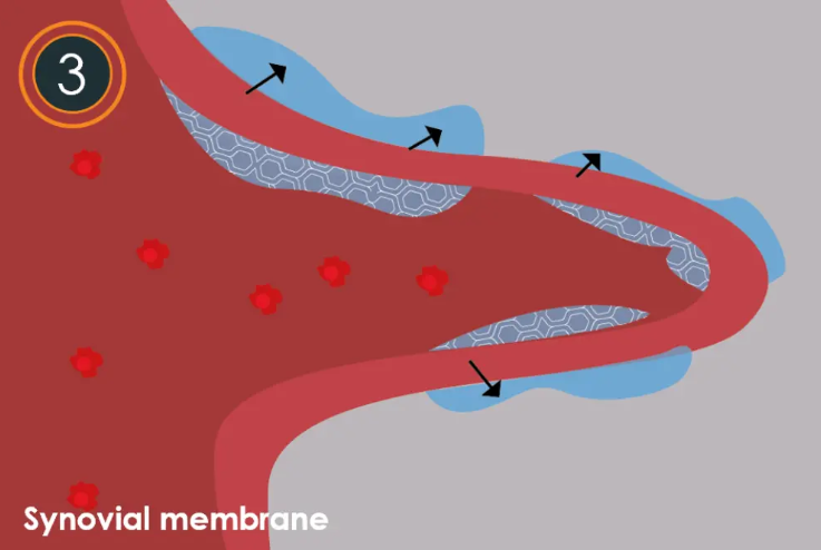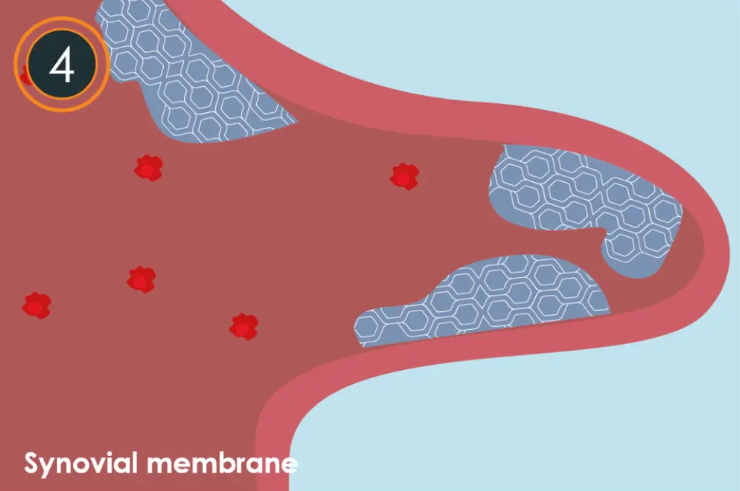 - Step 4: Complete integration Within approximately 6-12 weeks, the injectable 2.5% iPAAG implant fully integrates into the synovial membrane acting as a synovial scaffold within the subintima layer.